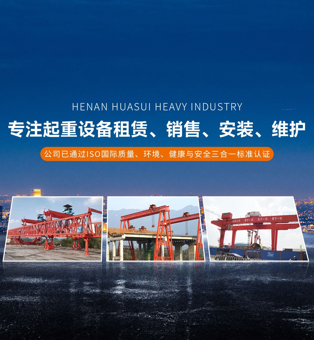 河南華隧重工機械裝備有限公司主要從事通用門式起重機、橋式起重機、電動單梁起重機,輪胎式起重機、架橋機、提梁機、遠梁平車、鋼絲繩電動萌蘆、卷揚機、起重配件制造、銷售:起重機械租賃、安裝和維修,起重設備園收,機械設備維修,鋼結構工程承包,橋梁工程及技術咨淘服務,銷售五金制品、機電設備:建設工程監理,建設工程設計,各類工程建設活動,建筑勞務分包,建筑物折除作業,施工作業,工程管理服務,土石方工程施工,裝如發運。  公司已通過IS0國際質量、環境、健康與安全三合一標準認證,特種設備制造許可證和特種設備安裝改造維修許可證。擁有完熟的質量管理體系。嚴格的管理制度,強大的生產能力和先進的檢測手段,在保證產品質量的同時,也具備了極強的市場競爭力。  公司堅持科技創新為理念,產品質量為核心,注重信譽,建立了減信可靠、快捷、思速。便利周到的售后服務網絡。  我們擁有的技術專家和技術服務隊伍為客戶提供充善的售前技術支持和全天候的售后服務體系,讓您無后顧之憂,享受一站式的超值服務。  “華隧重工,伴您成功“是華隧重工永遠的宗指,真被的希望與各界朋友攜手并進。共創輝準!